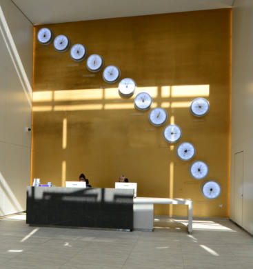 DescriptionA pice of art behind the reception of Deutsche Bank. Twelve clocks in an arc representing daylight at the equinox. A thirteenth clock marks the time in Brummidge, an imaginary city invented by Birmingham writer David Lodge. Condition: ExcellentOversight/Owner: Deutsche BankArtist website: www.raqsmediacollective.netOther Info: